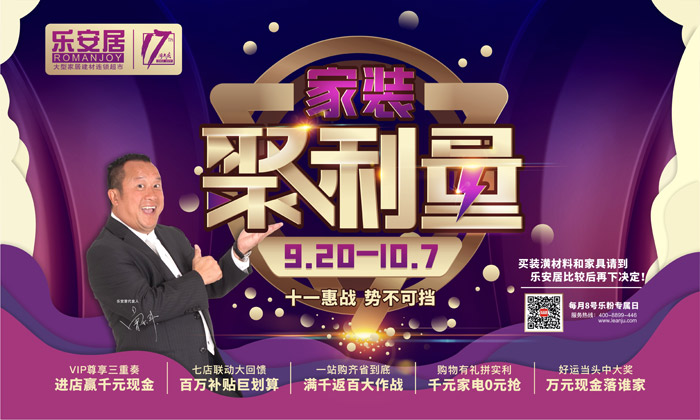 新中国成立70周年大庆即将到来,红旗招展,彩旗飘飘!中国人最喜团聚,聚是一团火,家和万事兴!故今年乐安居以“聚”为义,以“家”为魂!9月20—10月7日,喜迎国庆,同时感恩回馈广大消费者,乐安居花大手笔打造一场盛大空前的“家装聚利量”活动:千万补贴让利,满千返百放送,万元现金大奖加持!有利量嗨到底,真低价不怕比,誓要回馈全城,将让利进行到底!